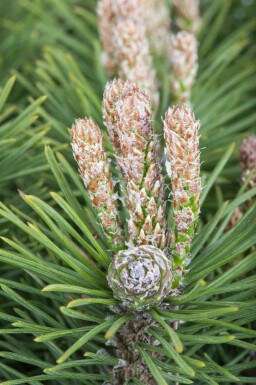 - De bast van Pinus mugo 'Mops' is grijsbruin en de takken zijn stevig en compact.