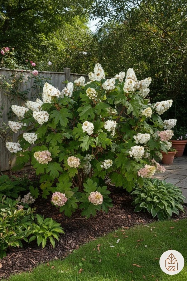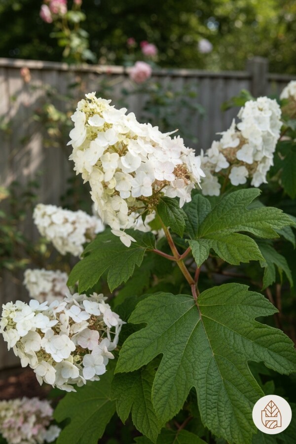 • De Hydrangea quercifolia bloeit van juli tot september met grote, witte pluimen die roze verkleuren. Deze bloemen trekken bijen en vlinders aan, maar zijn niet geurend.