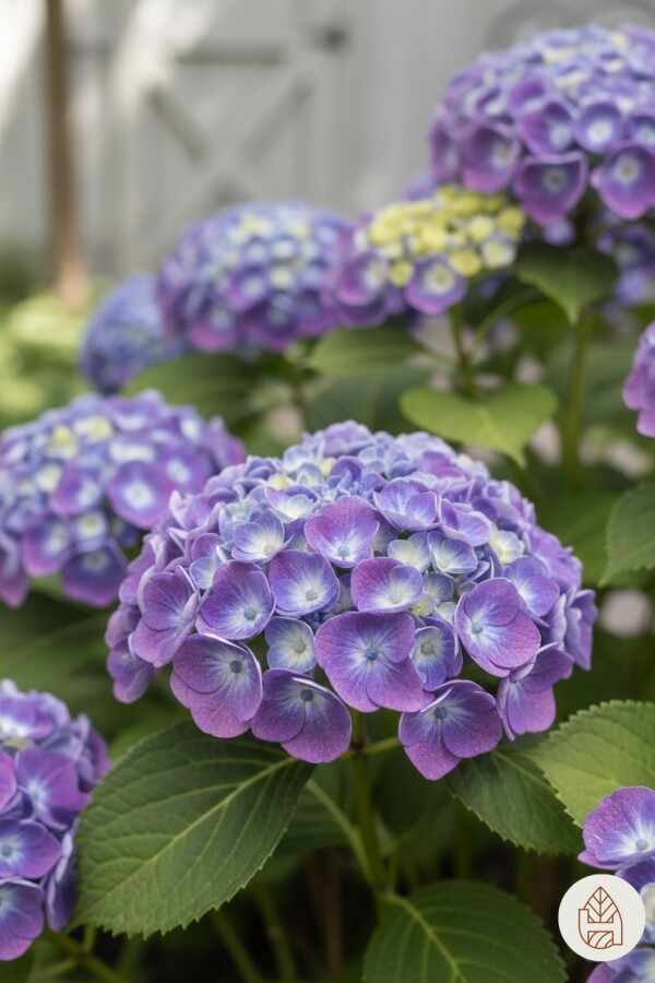 • Hydrangea macrophylla 'Ayesha' bloeit van juli tot september met paarse bloemen. De bloemen hebben een lepelvormige structuur en trekken bijen en vlinders aan.