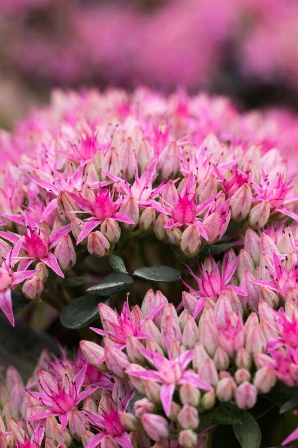 Sedum spectabile 'Carl', ook wel bekend als vetkruid of hemelssleutel, is een populaire vaste plant in veel tuinen. De Sedum heeft een polvormende en opgaande groeiwijze, waardoor het een aantrekkelijke structuur in de tuin biedt. Deze plant bereikt een gemiddelde hoogte van ongeveer 40 cm en heeft een breedte die vergelijkbaar is. Het blad van de Sedum spectabile 'Carl' is groen, vlezig en voelt stevig aan, wat een kenmerk is van deze soort. Hoewel het blad niet groenblijvend is, blijft de plant aantrekkelijk door zijn onderhoudsarme karakter. Vetkruid is gemakkelijk te combineren met andere planten en kan jaarrond geplant worden, wat het een veelzijdige keuze maakt voor borders en groepsbeplanting.