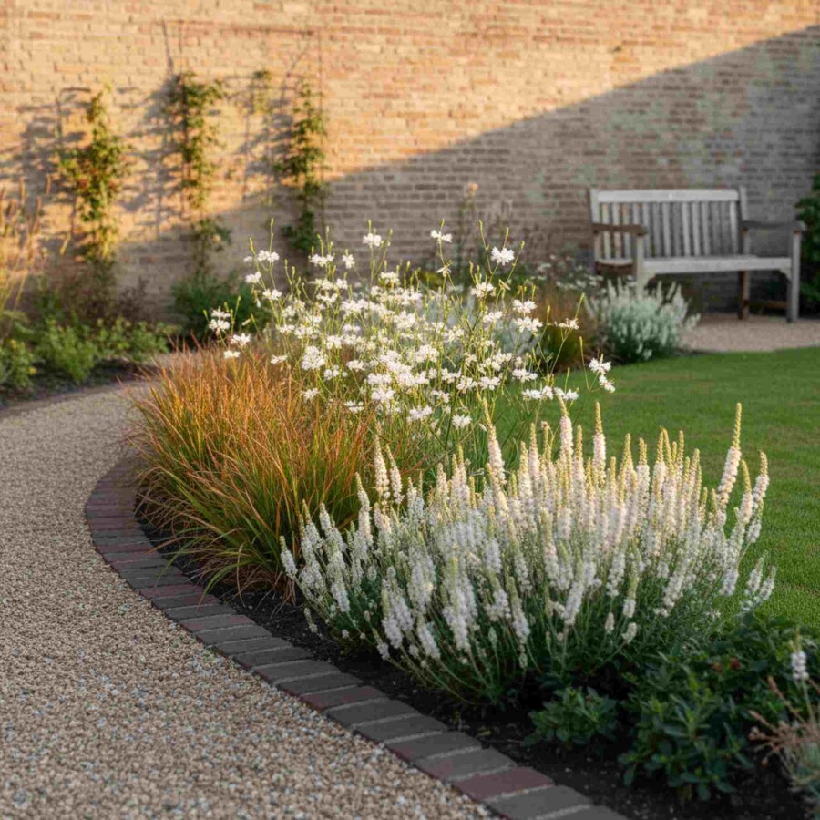 • Warme kleureffecten met oranje Carex en witte bloemen van Gaura en Liatris